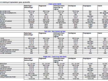 Tabel til indstilling af alle mejetærsker modeller